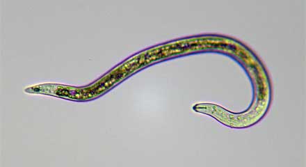 Nematodes are incredibly diverse, thread-like roundworms that live in a wide range of soils. Mostly microscopic in size, nematodes have varied methods of survival. A majority of nematodes are microbial feeders found in the soil. They can feed on diverse food sources, including bacteria, fungi, and even other nematodes!